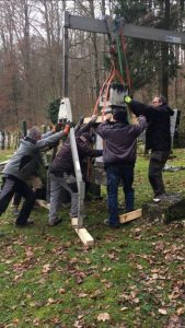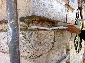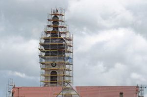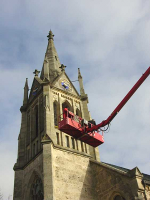 Hoch hinauf ging es bei der Begutachtung des Natursteinbaus der St. Gallus – Kirche. Der Ort Böhringen liegt bereits rund 800 m hoch und mit dem LKW-Steiger schwebten wir nochmals 36 m höher bis zur Turmspitze hinauf. Der Zustand der Natursteine ist oft noch recht gut – dringend muss jedoch nach den Fugen gesehen werden.