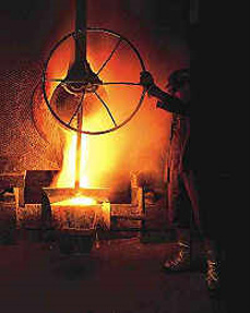 Nun kommt der alles entscheidende Augenblick des Gießens: die im Tiegelofen auf ca. 1250 Grad Celsius erhitzte flüssige Bronze wird von der Schlacke befreit und dann in einem Zug in die ausgebrannte Form gegossen.