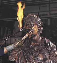 Ein ausgeprägtes Zeit- und Fingerspitzengefühl, große Erfahrung und eine absolut ruhige Hand sind dabei die wesentlichen Voraussetzungen, um ein Gießergebnis allererster Güte zu erzielen. Stetig bahnt sich die flüssige Bronze ihren Weg in die vom Wachs hinterlassenen Hohlräume, ohne an der Außenfläche Blasen zu bilden. Die Bronze kann nun erkalten und der Schamottemantel abgeschlagen werden.
