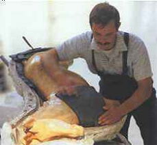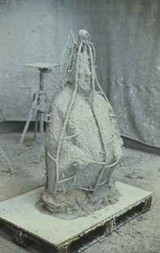 Nach einigen Minuten des Erkaltens entsteht eine Wachsschicht. Das überschüssige Wachs wird wieder ausgegossen, so dass ein hohles Wachsmodell entsteht. Dieser „Wachsrohling“ wird mit einem Schamottekern gefüllt, danach vom Künstler nochmals retuschiert und anschließend mit Gusskanälen versehen.